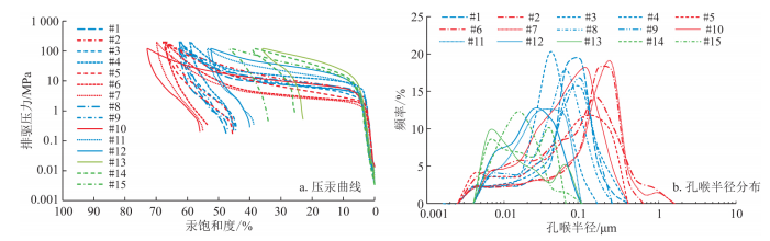 图3 砂岩压汞曲线特征和孔喉半径分布特征