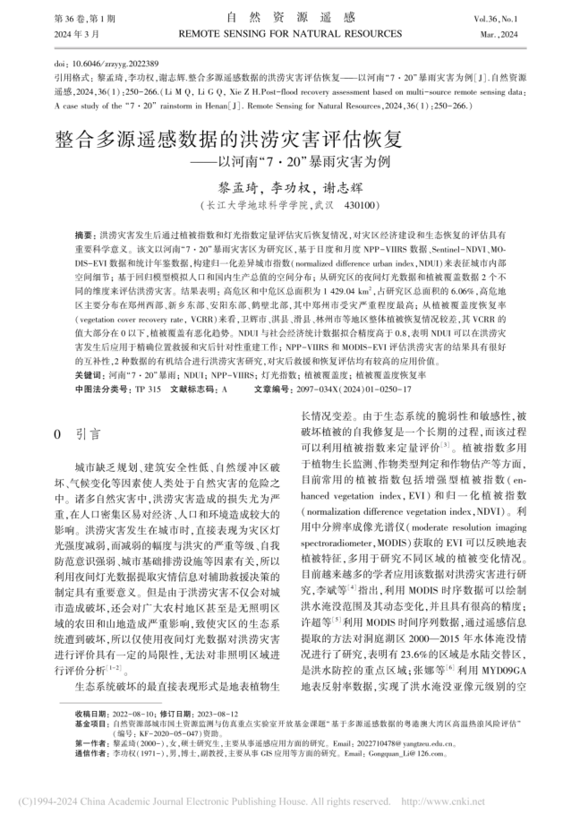 地科学院李功权课题组硕士生黎孟琦在北大核心期刊《自然资源遥感》上发表题为“整合多源遥感数据的洪涝灾害评估恢复——以河南“7·20”暴雨灾害为例”的研究论文。伟德国际1949官网为论文第一署名单位,硕士研究生黎孟琦为论文第一作者。