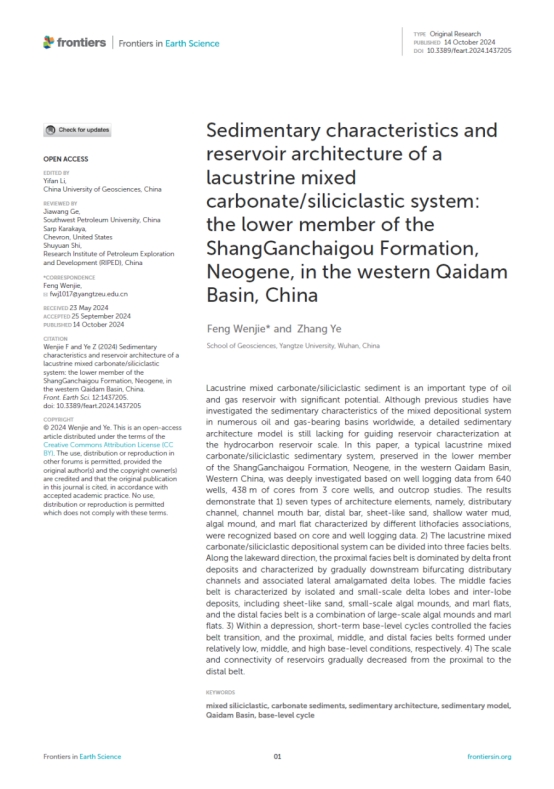 伟德国际1949官网教师冯文杰在《Frontiers in Earth Science》上发表题为“Sedimentary characteristics and reservoir architecture of a lacustrine mixed carbonate/siliciclastic system: the lower member of the ShangGanchaigou Formation, Neogene, in the western Qaidam Basin, China”的研究论文。该论文针对柴达木盆地西部地区新近系上干柴沟组下段混积体系开展野外露头无人机倾斜摄影建模与解剖、地下储层表征,明确了油田开发尺度下,混积体系沉积特征与沉积模式。