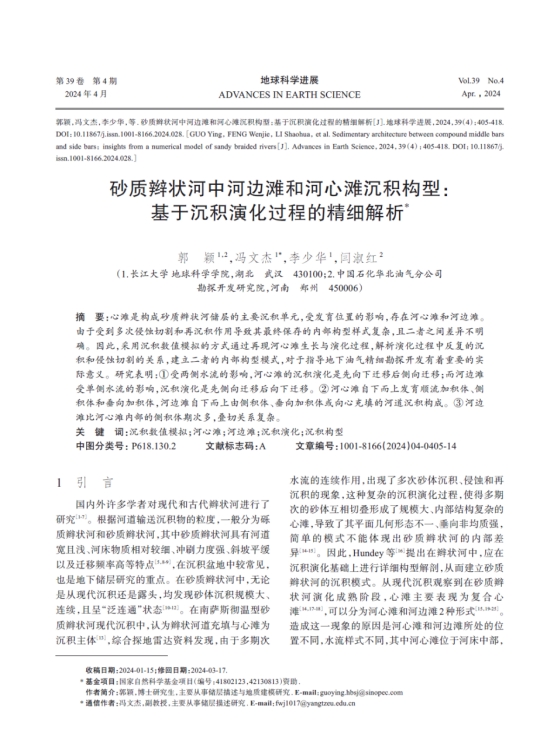 伟德国际1949官网博士生郭颖在《地球科学进展》上发表题为“砂质辫状河中河边滩和河心滩沉积构型:基于沉积演化过程的精细解析”的研究论文。该论文采用沉积数值模拟的方式通过再现河心滩生长与演化过程,解析演化过程中反复的沉积和侵蚀切割的关系,建立二者的内部构型模式,对于指导地下油气精细勘探开发有着重要的实际意义。