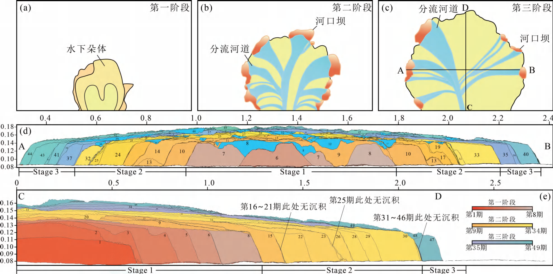 研究表明:①辫状河三角洲沉积演化过程中,三角洲的规模、水流分散样式、沉积体表面地貌特征及沉积物分布样式存在阶段性差异,可据此将实验辫状河三角洲的演化分为3 个阶段。②在整个沉积演化过程中,伴随着三角洲规模的逐渐增大,分流河道的宽度逐步减小、流程变长、分流河道数量逐步增加,三角洲前缘沉积由少量弧形的连续分布朵体转变为多个孤立分布的小规模朵体。④模拟过程中,分流河道表现为多个侵蚀—回填的自旋回演化过程,形成了多套自旋回沉积复合体。⑤ 辫状河三角洲前积层存在自下而上、由近向远表现为沉积连续性逐步减小、叠切规律逐渐复杂的特性。