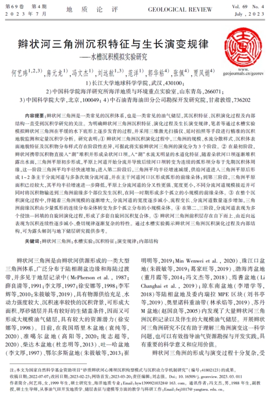 伟德国际1949官网本科生何艺玮在《地质论评》上发表题为“辫状河三角洲沉积特征与生长演变规律——水槽沉积模拟实验研究”的研究论文。该论文通过水槽实验模拟辫状河三角洲在平缓的水下底形上逐步发育的过程,并采用三维激光扫描仪、延时拍照等手段进行精准的沉积地貌监测和定量沉积学分析。