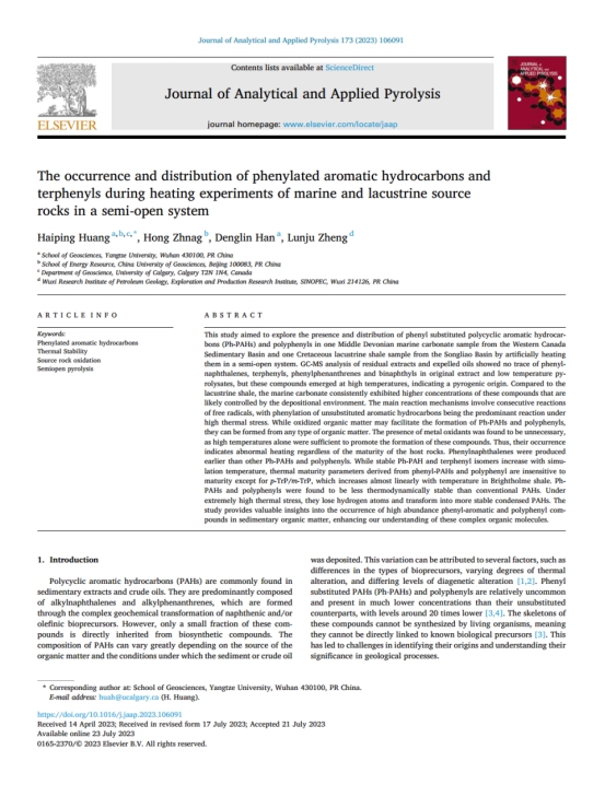 地科学院黄海平教授以第一作者身份在《Journal of Analytical and Applied Pyrolysis》期刊发表题为“The occurrence and distribution of phenylated aromatic hydrocarbons and terphenyls during heating experiments of marine and lacustrine source rocks in a semi-open system”的研究论文,伟德国际1949官网为论文第一署名单位。