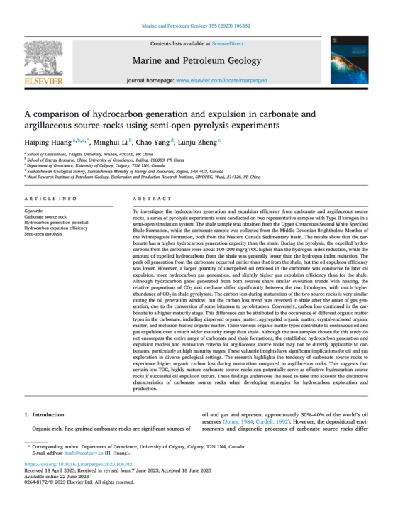 地科学院黄海平教授以第一作者身份在《Marine and Petroleum Geology》期刊发表题为“A comparison of hydrocarbon generation and expulsion in carbonate and argillaceous source rocks using semi-open pyrolysis experiments”的研究论文,伟德国际1949官网为论文第一署名单位。