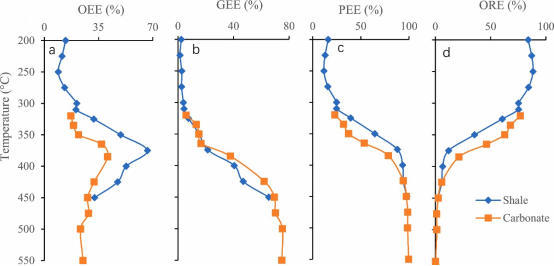 Fig. 4. Changes of oil expulsion efficiency (OEE), gas expulsion efficiency (GEE), petroleum expulsion efficiency (PEE) and oil retention efficiency (ORE), with increasing temperature.