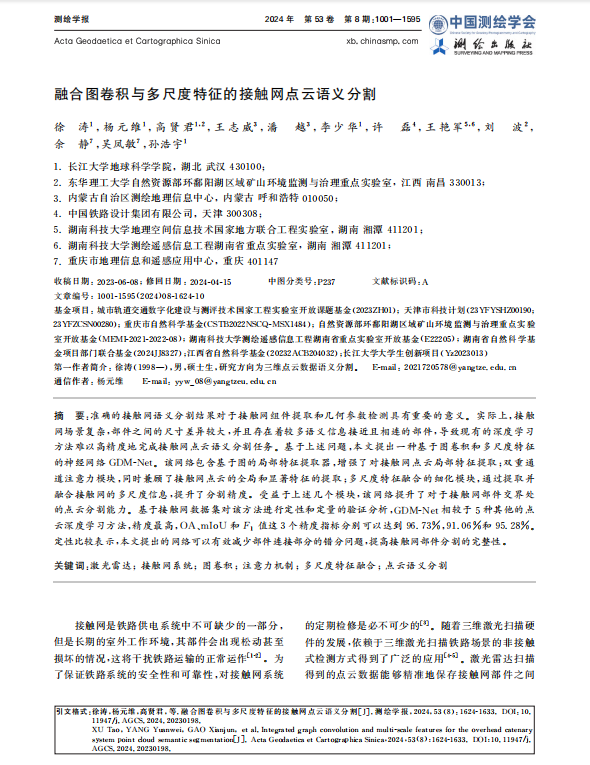 地科学院硕士生徐涛在测绘领域主流期刊《测绘学报》上发表题为“融合图卷积与多尺度特征的接触网点云语义分割”的研究论文。