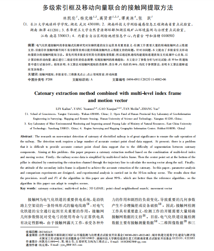 地科学院硕士生林凯伦在《测绘通报》上发表论文提出一种新型联合多级索引框及移动向量的接触网提取方法