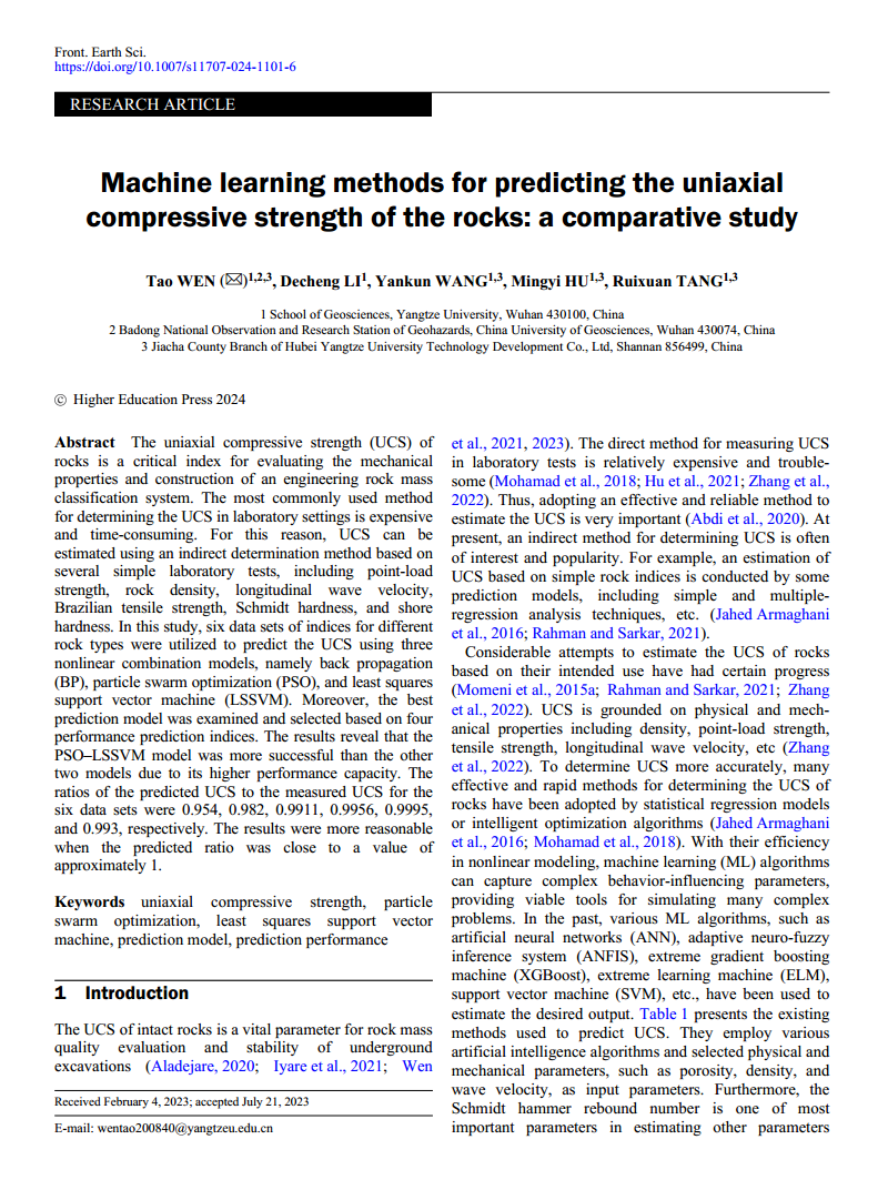地科学院温韬教授以第一作者身份在《Frontiers of Earth Science》上发表题为“Machine learning methods for predicting the uniaxial compressive strength of the rocks: a comparative study”的研究论文。伟德国际1949官网为论文第一署名单位。