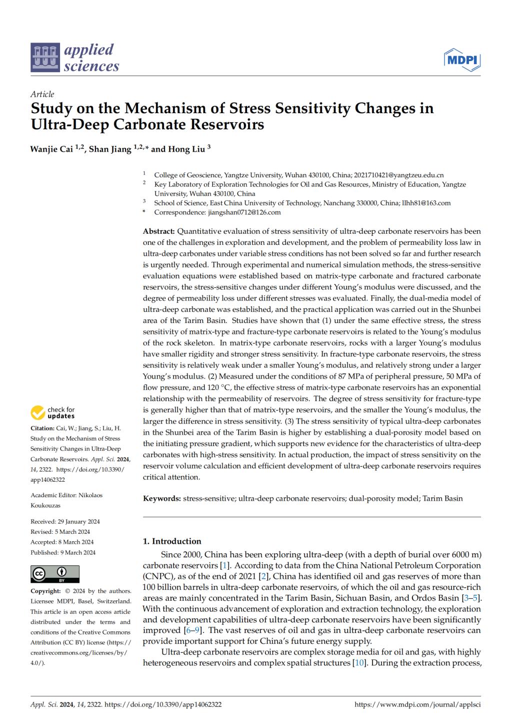 地科学院硕士生蔡万杰在《Applied sciences》发表题为“Study on the Mechanism of Stress Sensitivity Changes inUltra-Deep Carbonate Reservoirs”的研究论文。伟德国际1949官网为论文第一署名单位,硕士生蔡万杰为论文第一作者,教师江山为通讯作者。