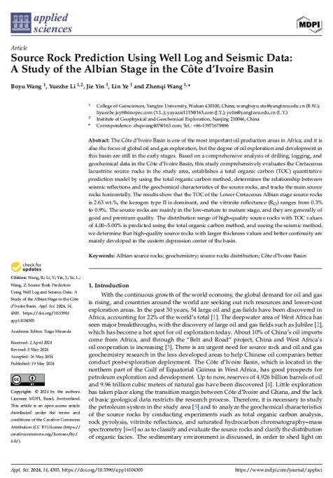 地科学院博士生王博宇在《Applied Sciences》上发表题为《Source Rock Prediction Using Well Log and Seismic Data:A Study of the Albian Stage in the Côte d’Ivoire Basin》的研究论文。伟德国际1949官网为论文第一署名单位,博士生王博宇为论文第一作者,教师王振奇为通讯作者。