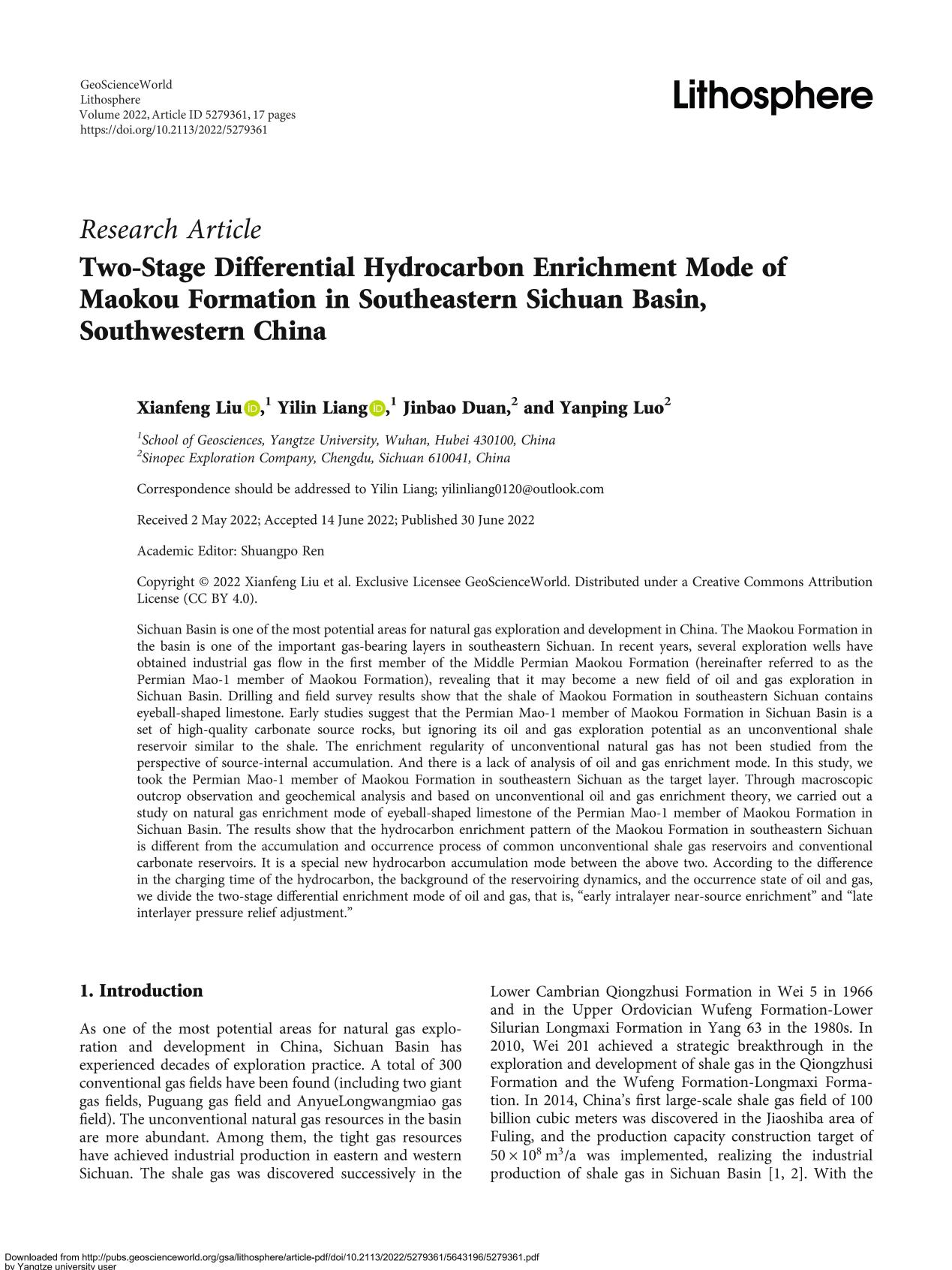 地科学院教师刘显凤在《LITHOSPHERE》上发表题为“Two-Stage Differential Hydrocarbon Enrichment Mode of Maokou Formation in Southeastern Sichuan Basin, Southwestern China”的研究论文。伟德国际1949官网为论文第一署名单位,教师刘显凤为论文第一作者,博士生梁祎琳为通讯作者。