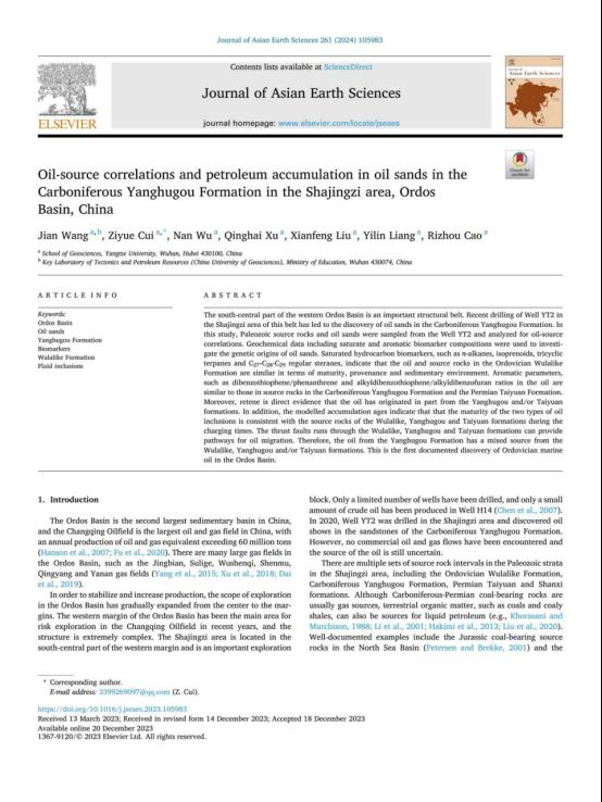 地科学院王健在《Journal of Asian Earth Sciences》发表题为“Oil-source correlations and petroleum accumulation in oil sands in the Carboniferous Yanghugou Formation in the Shajingzi area, Ordos Basin, China”的研究论文。伟德国际1949官网为论文第一署名单位,教师王健为论文第一作者。