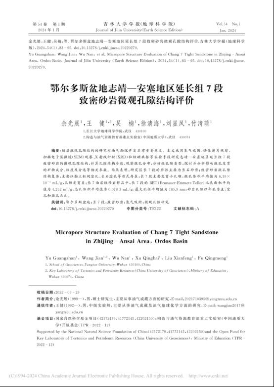 地科学院硕士生余光展在《吉林大学学报(地球科学版)》上发表题为“鄂尔多斯盆地志靖—安塞地区延长组7段致密砂岩微观孔隙结构评价”的研究论文。伟德国际1949官网为论文第一署名单位,硕士生余光展为论文第一作者,教师王健为通讯作者。