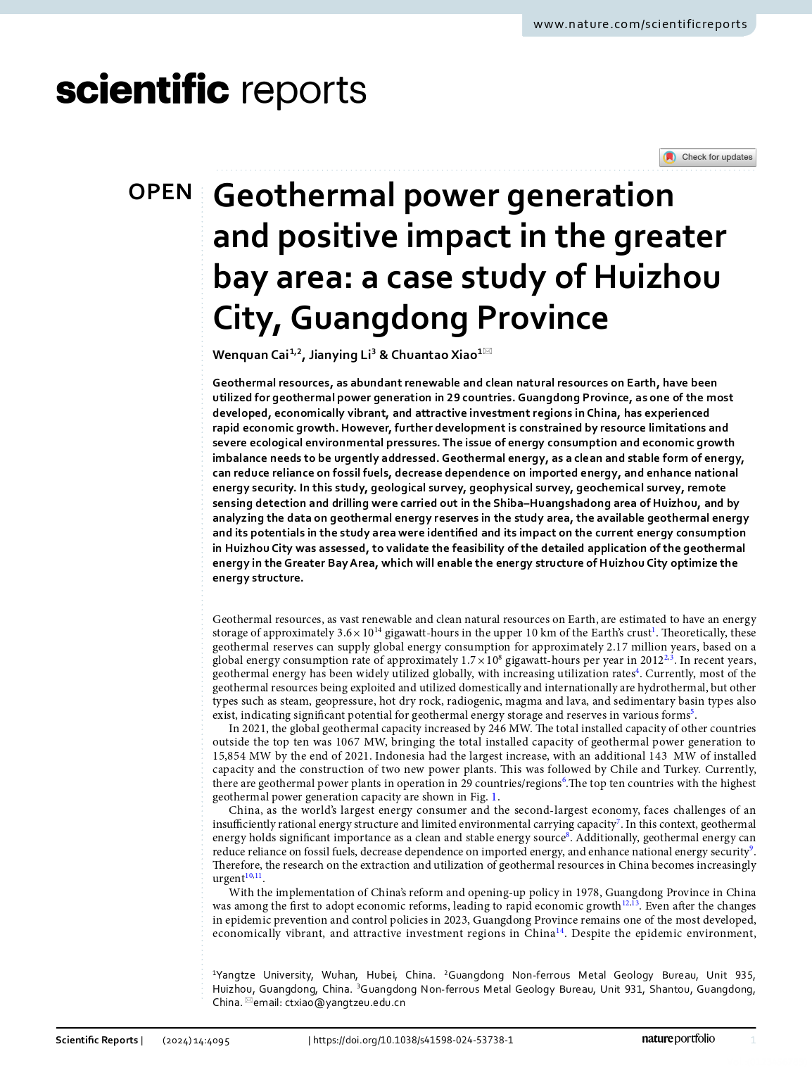 伟德国际1949官网地质学专业硕士生蔡文权在国际综合类科技期刊《Scientific Reports》上发表题为“Geothermal power generation and positive impact in the greater bay area: a case study of Huizhou City, Guangdong Province”的研究论文。伟德国际1949官网为论文第一署名单位,硕士研究生蔡文权为论文第一作者,其导师肖传桃教授为该文通讯作者。