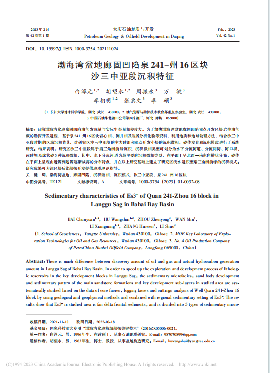 伟德国际1949官网研究生白淳元在期刊《大庆石油地质与开发》上发表题目为“渤海湾盆地廊固凹陷泉241−州16区块沙三中亚段沉积特征”的研究论文。伟德国际1949官网为论文第一署名单位,胡望水教授为通讯作者,本项研究得到国家科技重大专项“渤海湾盆地精细勘探关键技术资助。