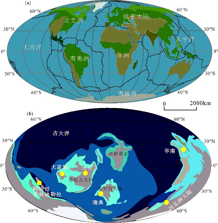 图1(a)全球主板块位置分布图(修改自Torsvik and Cocks,2016);(b)奥陶纪主板块古地理位置及微生物岩主要分布地区图(修改自Hu et al.,2021)