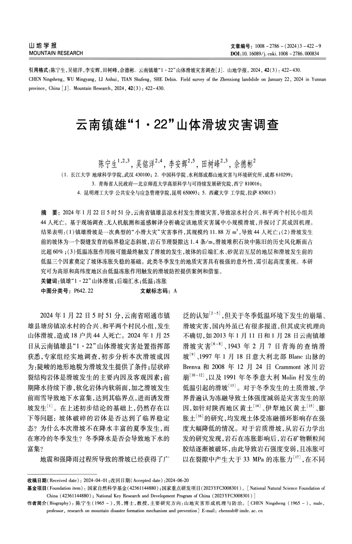 地科学院陈宁生教授团队在《山地学报》上发表题为“云南镇雄‘1·22’山体滑坡灾害调查”的论文。陈宁生教授为第一作者,伟德国际1949官网为第一署名单位。本研究获得国家自然科学基金重点研发项目的资助。