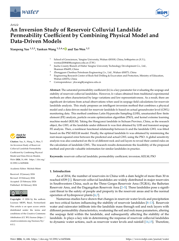 伟德国际1949官网王艳昆副教授以通讯作者身份在SCI期刊《Water》上发表题为“An Inversion Study of Reservoir Colluvial Landslide Permeability Coefficient by Combining Physical Model and Data-Driven Models”的研究论文,该项研究得到了国家自然科学基金、湖北省自然科学基金和西藏自治区科技厅项目的共同资助。