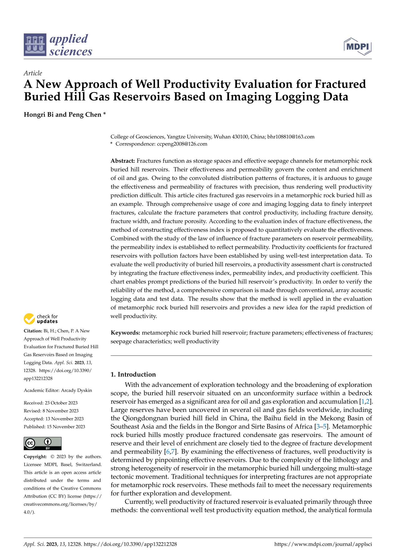 地科学院硕士生毕宏日在《Applied Sciences》发表题为“A New Approach of Well Productivty Evaluation for Fractured Buried Hill Gas Reservoirs Based on lmaging Logging Data”的研究论文。伟德国际1949官网为论文第一署名单位,硕士生毕宏日为论文第一作者,教师陈鹏为通讯作者。