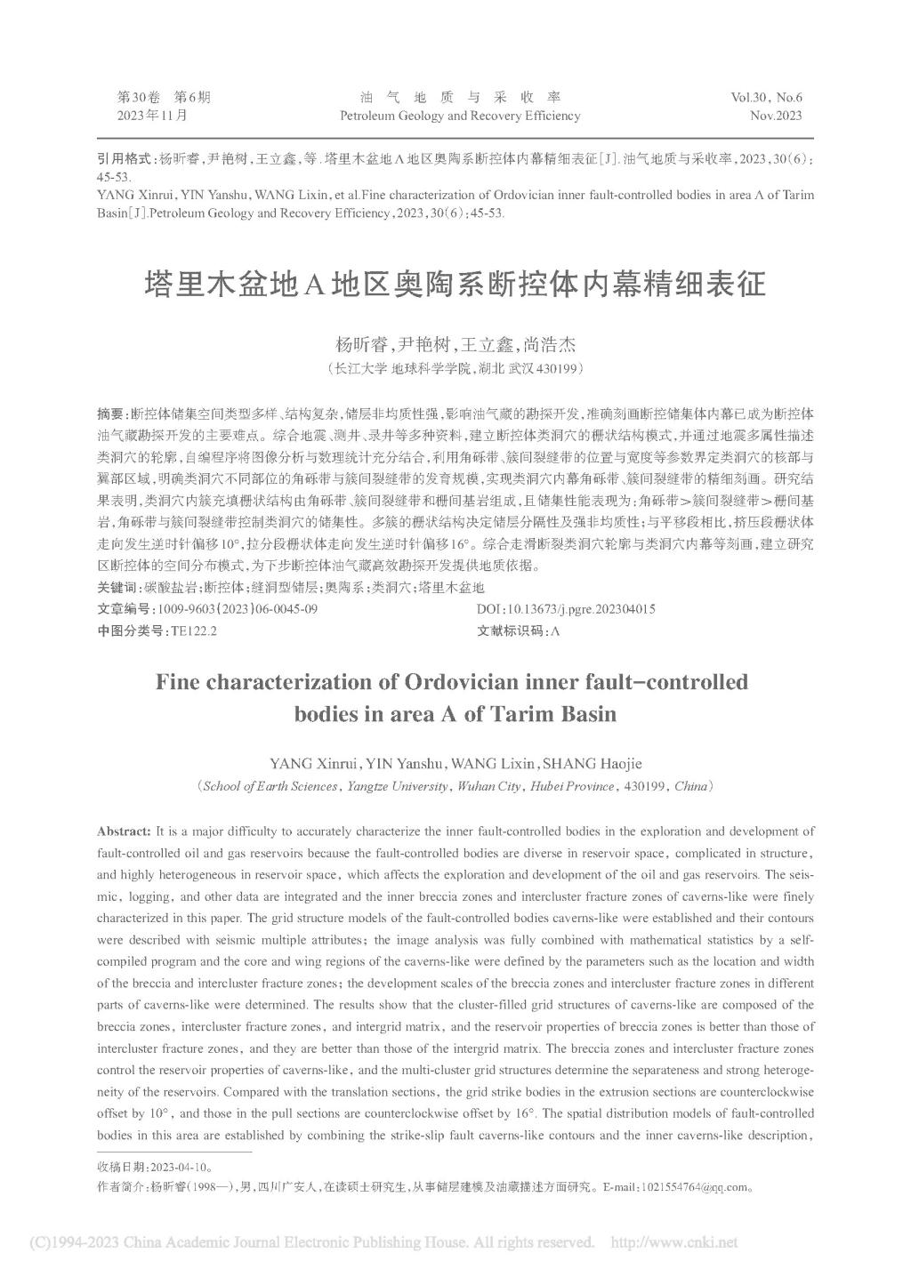 伟德国际1949官网地质学研究生杨昕睿在《油气地质与采收》上发表了题为“塔里木盆地A地区奥陶系断控体内幕精细表征”的研究论文。