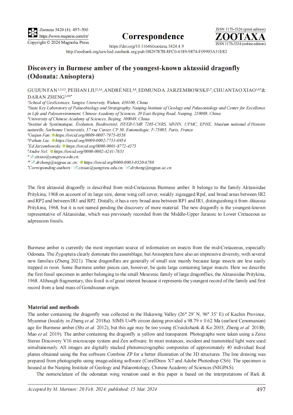 伟德国际1949官网地质学专业硕士研究生范桂君同学在生物学期刊《Zootaxa》上发表题为“Discovery in Burmese amber of the youngest-know naktassiid dragonfly (Odonata: Anisoptera)”的研究论文,伟德国际1949官网为论文第一署名单位,范桂君为第一作者,其导师肖传桃教授为该文第一通讯作者。