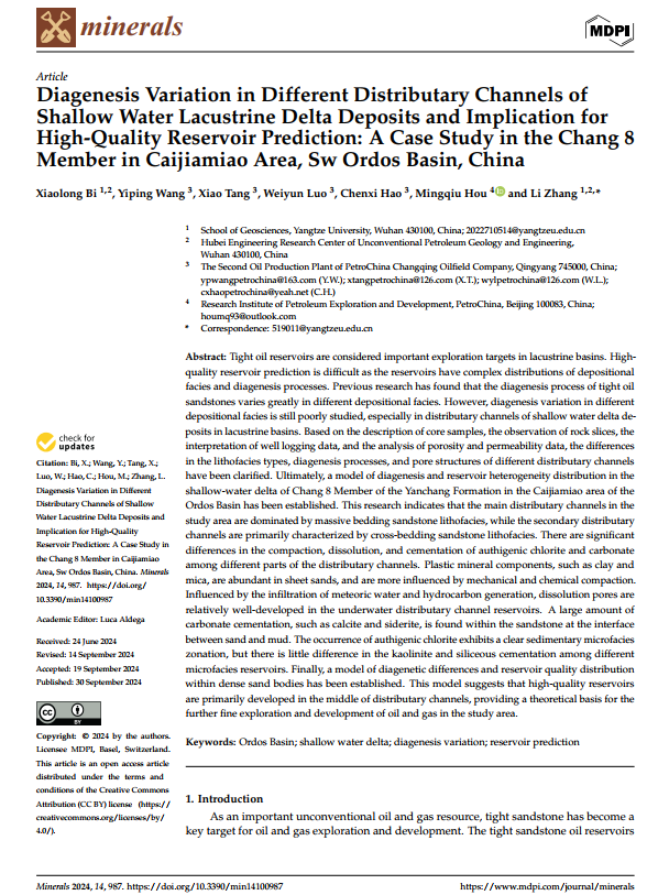 地科院硕士生毕小龙在张莉副教授的指导下,在期刊《Minerals》上发表题为《Diagenesis Variation in Different Distributary Channels of Shallow Water Lacustrine Delta Deposits and Implication for High-Quality Reservoir Prediction: A Case Study in the Chang 8 Member in Caijiamiao Area, Sw Ordos Basin, China》的研究论文,伟德国际1949官网为论文第一署名单位,硕士生毕小龙为论文第一作者,其导师张莉副教授为该文通讯作者。