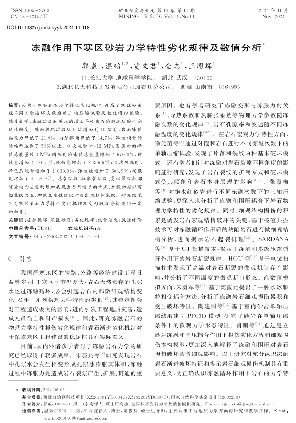 地科学院温韬教授团队长期从事冻融岩石力学、滑坡演化机理及预测与防治、岩土体稳定性评价与数值模拟、岩石力学特性表征、机器学习等方面的研究,团队硕士生郭威在核心期刊《矿业研究与开发》上发表题为《冻融作用下寒区砂岩力学特性劣化规律及数值分析》的研究论文。伟德国际1949官网为论文第一署名单位,硕士生郭威为论文第一作者,温韬教授为该文通讯作者,本项研究得到西藏自治区科技项目和国家自然科学基金项目共同资助。