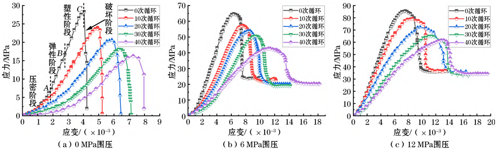 研究冻融岩石的物理力学特性损伤劣化规律和岩石渐进劣化机制对于保障寒区工程建设的稳定性具有实际意义。文章以高寒地区砂岩为研究对象,对五组岩样进行0、10、20、30和40次不同周期的冻融循环试验,再进行围压为0MPa、3MPa、6MPa、9MPa和12MPa的常规三轴试验,之后建立PFC3D模型对比分析砂岩力学劣化规律和宏微观能量变化趋势。研究结果表明:冻融次数和围压的增加导致岩石的破坏从脆性向延性转变。随着冻融次数的增加,岩石峰值黏聚力、内摩擦角及弹性模量都大幅下降。随着围压的增加,岩石峰值总能量、弹性能及耗散能都大量增加。总裂纹数、拉张裂纹数和剪切裂纹数都随着轴向应变的增加展现出S型增长的特点,加载初期以剪切裂纹为主,加载至塑性阶段开始出现拉伸裂纹。研究结果可为寒区岩石力学特性劣化机理及变形破坏分析提供一定的指导。