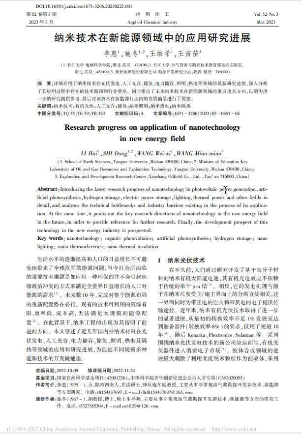 公司硕士生李惠在中文期刊《应用化工》上发表了题为“纳米技术在新能源领域中的应用研究进展”的研究论文。伟德国际1949官网为论文第一署名单位,研究生李惠为论文第一作者,教师施冬为通讯作者。