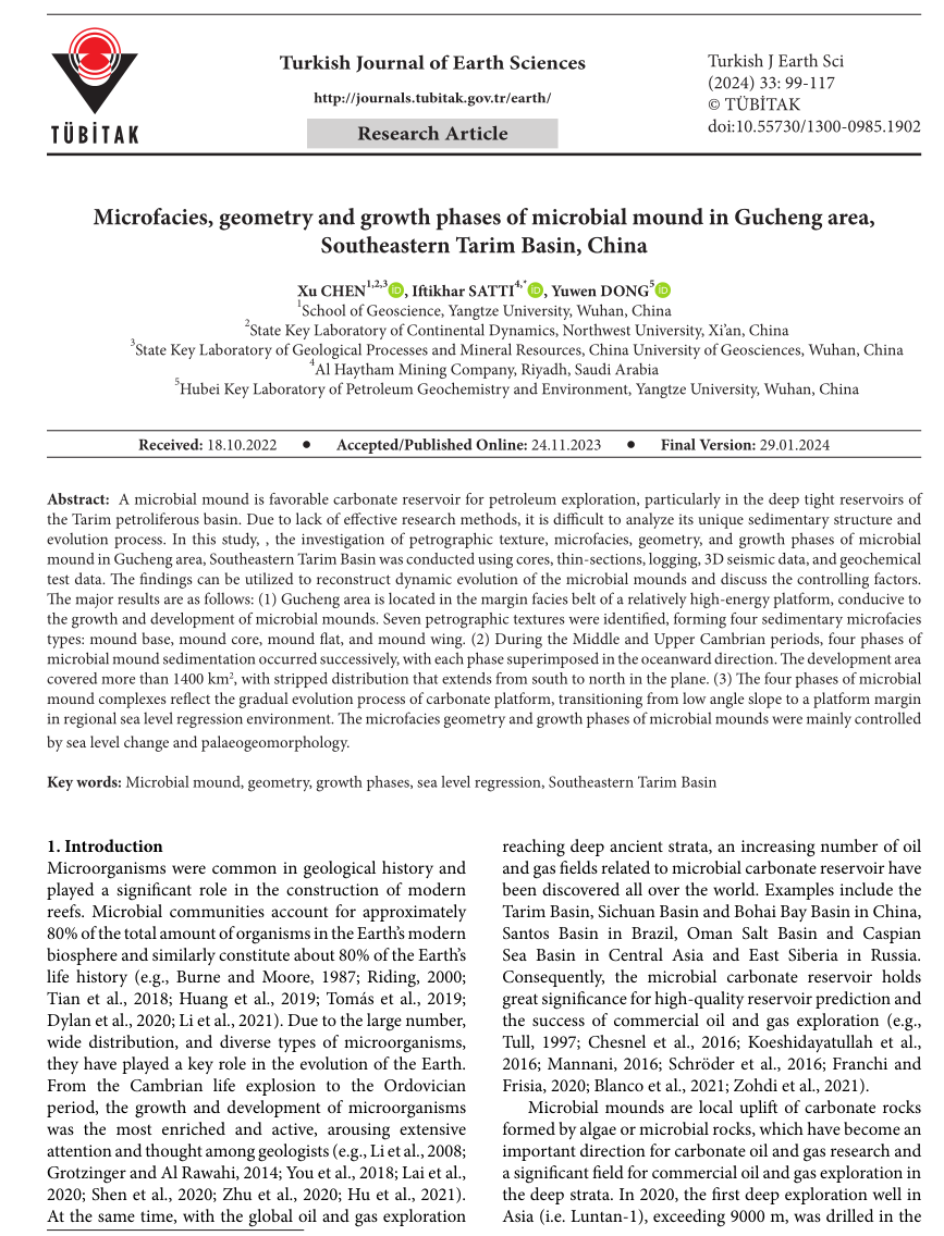 伟德国际1949官网陈旭副教授以第一作者身份在《Turkish Journal of Earth Sciences》上发表题为“Microfacies, geomety, and growth phases of microbial mound in Gucheng area, Tarim Basin, China”的研究论文,该项研究得到了湖北省自然科学基金的资助。