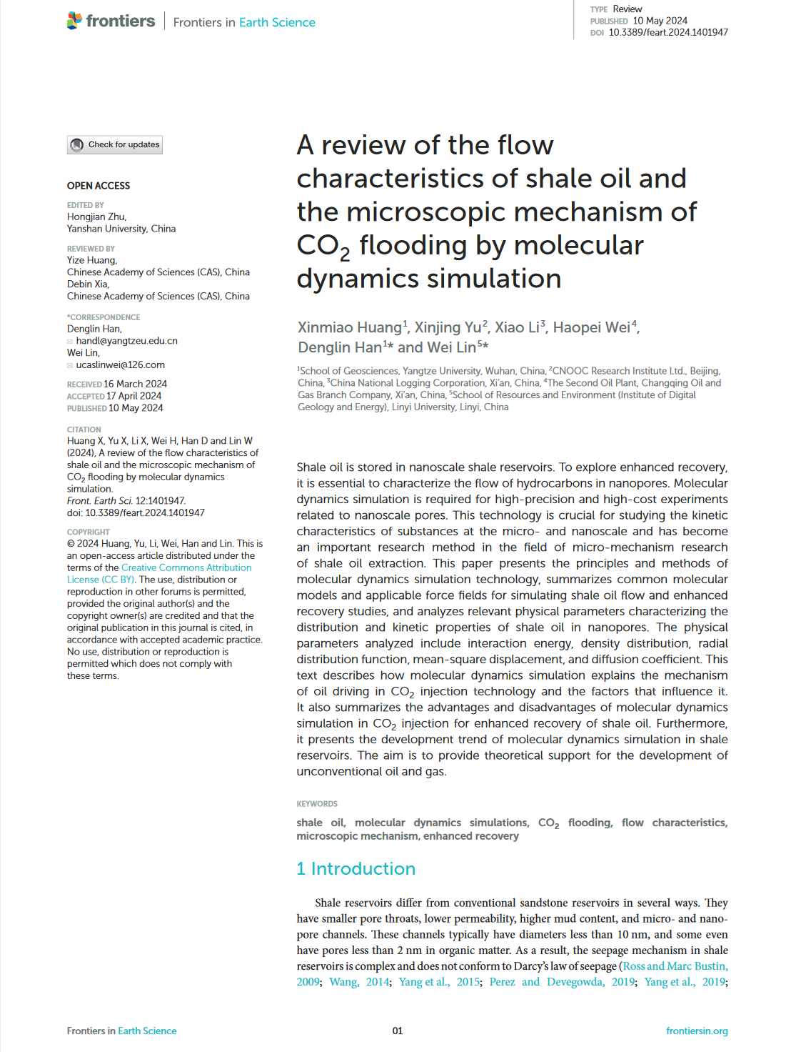 地科学院硕士研究生黄鑫淼在《Frontiers in Earth Science》发表了题为“A review of the flow characteristics of shale oil and the microscopic mechanism of CO2 flooding by molecular dynamics simulation”的综述论文,伟德国际1949官网为论文第一署名单位,黄鑫淼为论文第一作者,韩登林教授、林伟老师共同为该文通讯作者。