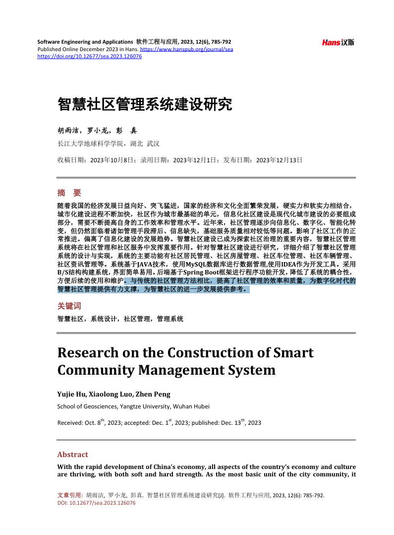 公司硕士生胡雨洁在中文期刊《软件工程与应用》上发表了题为“智慧社区管理系统建设研究”的研究论文。伟德国际1949官网为论文第一署名单位,研究生胡雨洁为论文第一作者,其导师罗小龙教授为该文通讯作者。