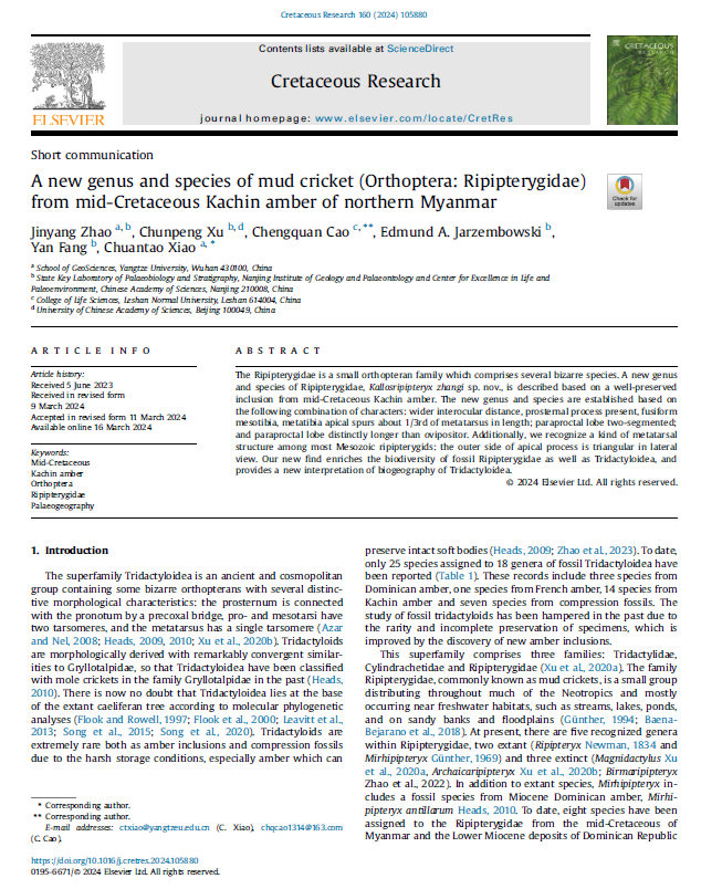伟德国际1949官网地质学专业硕士研究生赵金阳同学在在地学综合研究领域期刊《Cretaceous Research》上发表题为“A new genus and species of mud cricket (Orthoptera: Ripipterygidae) from mid-Cretaceous Kachin amber of northern Myanmar”的研究论文(图1)。伟德国际1949官网为论文第一署名单位,赵金阳为第一作者,其导师肖传桃教授为该文第一通讯作者。