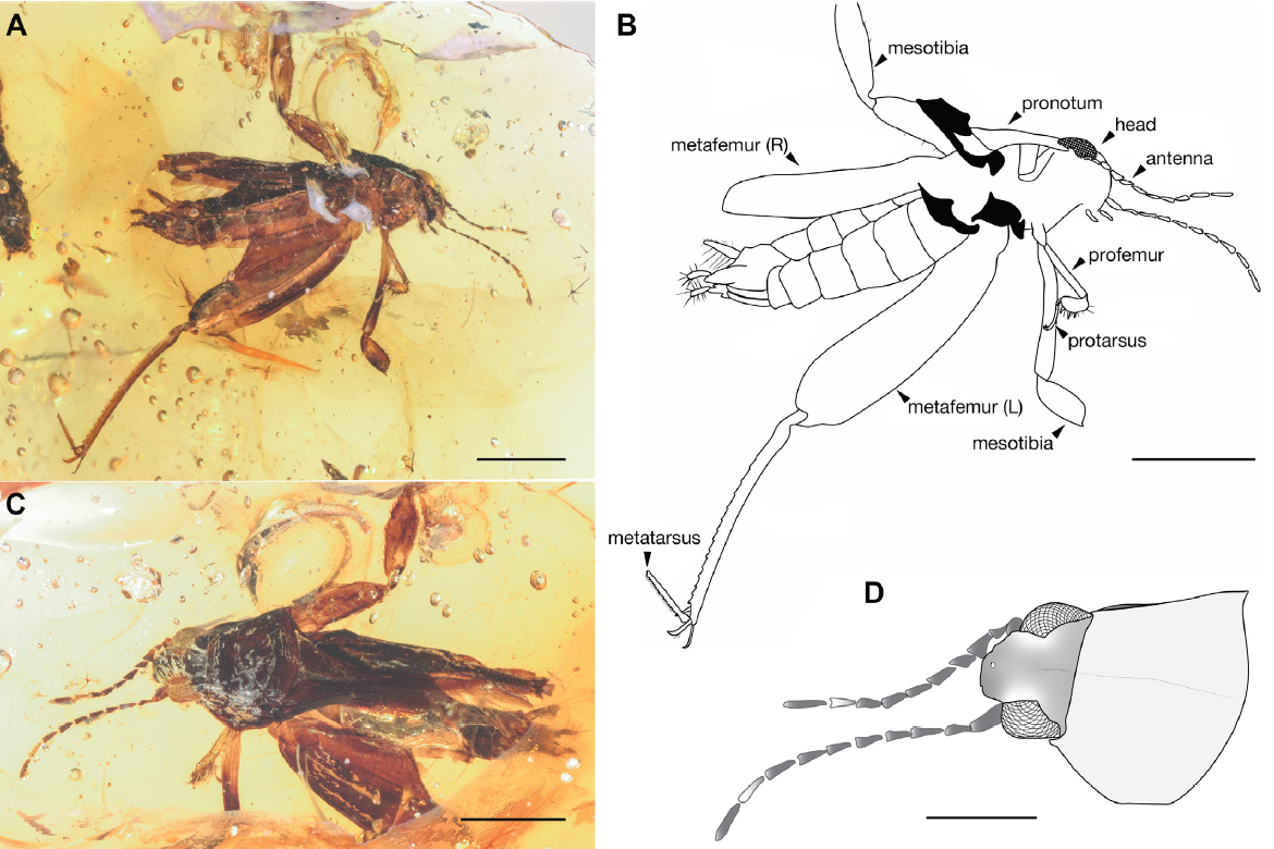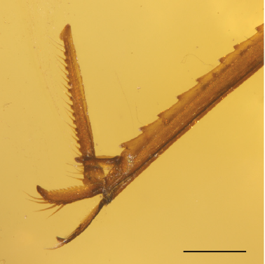 该研究以保存有蚤蝼新物种的琥珀化石标本为研究对象,通过对标本进行镜下拍照观察与描述对比,根据眼距较宽、存在前胸腹板突、胫骨端刺约占跖骨长度的 1/3;肛侧板突长于尾须等特征确认其为泽蚤蝼科Ripipterygidae的新属新种Kallosripipteryx zhangi(图2)。此外,在对新标本的镜下观察中,我们发现后足跗节并不是我们过去认识的那种整体,而是V形截面并使其内侧中空,两侧呈扩张的山脊状,刚毛生长在跗节外侧,在顶端有一个三角形的突起(图3)。最后,通过生物古地理学研究分析推测白垩纪时泽蚤蝼科物种几乎占据和蚤蝼科物种相等的生态位,而由于泽蚤蝼科在进化上要劣于蚤蝼科现在泽蚤蝼科物种仅限于新热带地区,为两个类群的演化史提出新的理解。