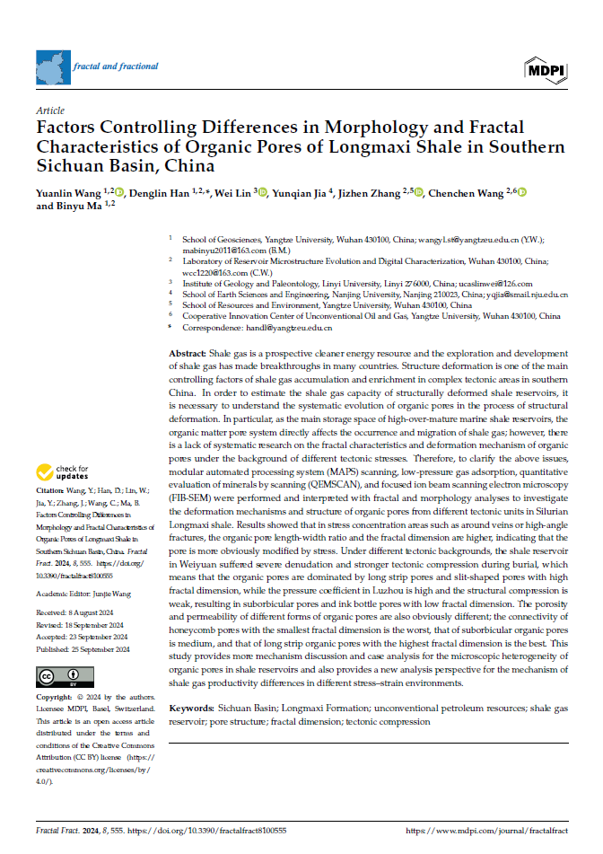 伟德国际1949官网地质资源与地质工程专业硕士研究生王园林在韩登林教授的指导下,以第一作者的身份在《fractal and fractional》上发表题为“Factors Controlling Differences in Morphology and Fractal Characteristics of Organic Pores of Longmaxi Shale in Southern Sichuan Basin, China”的研究论文。