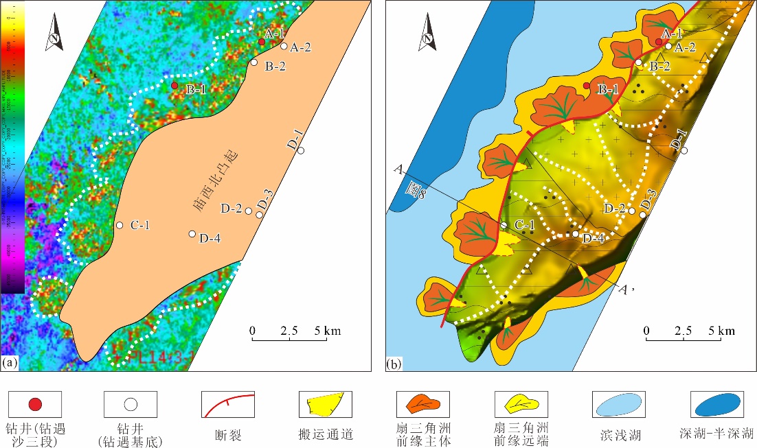 图1 渤海湾盆地庙西北地区构造特征(a)及庙西北凸起搬运通道特征(b)