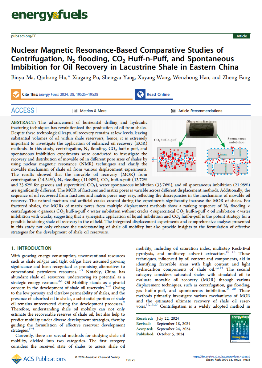 伟德国际1949官网地质系马斌玉博士以第一作者身份在《Energy & Fuels》上发表题为“Nuclear Magnetic Resonance-Based Comparative Studies ofCentrifugation, N2 flooding, CO2 Huff-n-Puff, and SpontaneousImbibition for Oil Recovery in Lacustrine Shale in Eastern China”的研究论文,该项研究得到了国家自然科学基金、中国博士后基金和油气地球化学与环境湖北省重点实验室开放基金的资助。