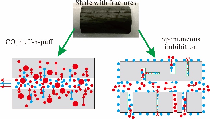 目前,页岩油的采收率依然很低。本次研究采用了核磁共振技术(NMR),开展了高速离心、氮气驱替、二氧化碳吞吐、自发渗吸等实验,评价了不同方法下的页岩可动油比例和分布,并阐明了页岩油的可动机理。结果表明,氮气驱替的可动油比例最低,二氧化碳吞吐和自发渗吸对页岩油的动用能力较高。不同方法中的裂隙和基质孔隙的可动油比例及动用顺序不同,在高速离心、氮气驱替和二氧化碳吞吐实验中,裂缝中的油比基质孔隙中的油更易移动,而在自发渗吸实验中,基质孔隙中的油首先驱替至裂缝中,然后再排出页岩,因此导致裂缝的可动油比例较低。天然裂缝和实验过程中产生的人为裂缝会显著增加页岩油的可动比例。自发渗吸和二氧化碳吞吐的协同应用是提高水力压裂后页岩采收率的最佳策略。本研究不仅提高了对页岩油可动性的认识,也为制定页岩油开发策略提供了思路。