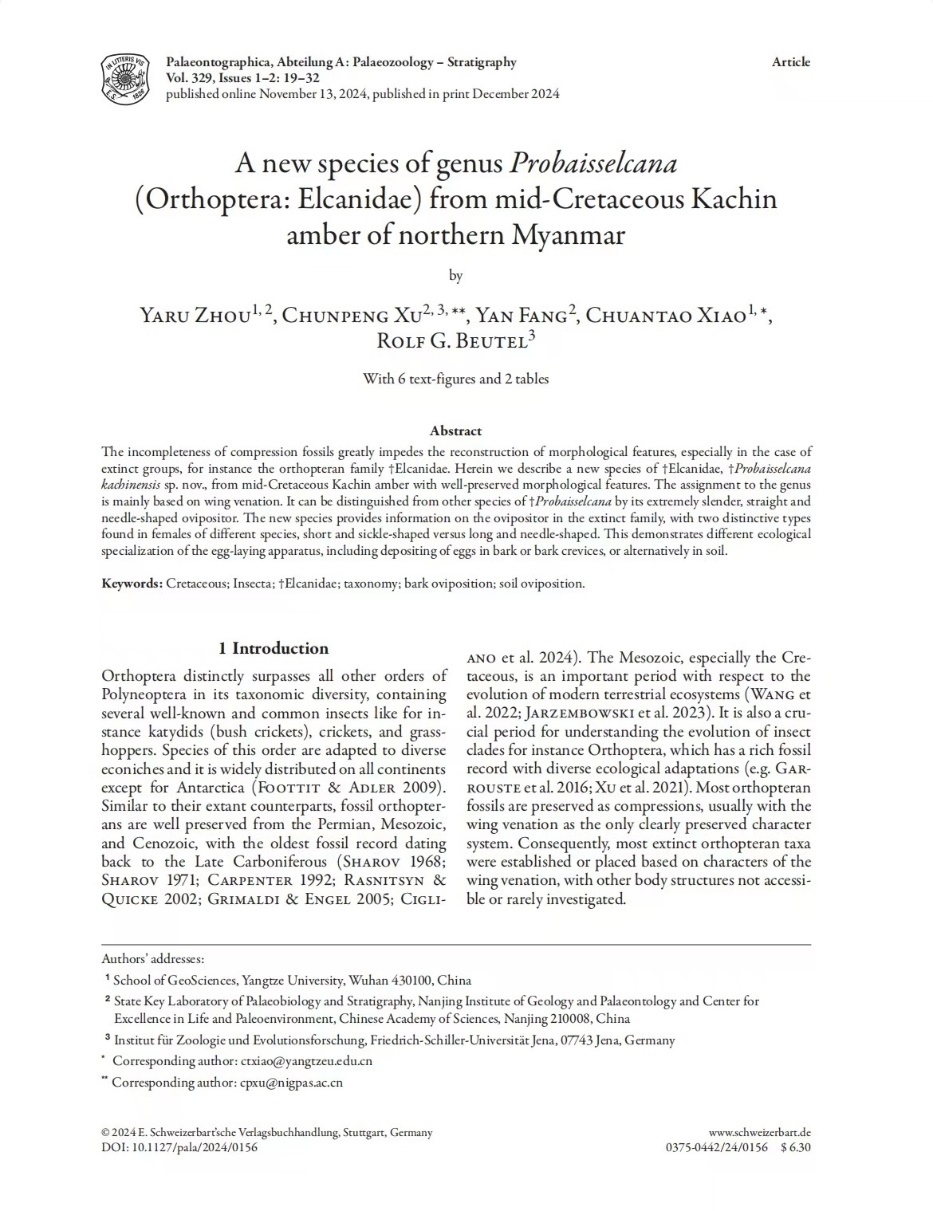 伟德国际1949官网地质学专业硕士研究生周雅茹在肖传桃教授、南京地质古生物研究所的许春鹏博士的共同指导下,在地球科学与古生物学领域期刊《PalaeontographicaAbteilungA》上发表题为“Anew species of genusProbaisselcana (Orthoptera:Elcanidae) from mid-Cretaceous Kachin amber of northern Myanmar”的研究论文。