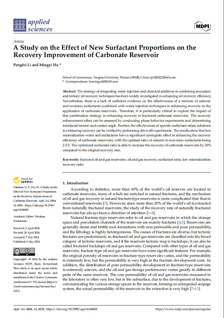 伟德国际1949官网2021级硕士生李鹏飞在期刊《Applied Sciences》上发表了题为“A Study on the Effect of New Surfactant Proportions on the Recovery Improvement of Carbonate Reservoir”的研究论文。伟德国际1949官网为论文第一署名单位,李鹏飞为第一作者,其导师胡明毅教授为该文通讯作者。