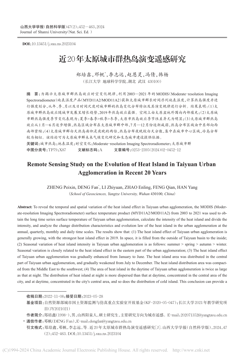 地科学院硕士生郑培鑫在北大核心期刊《山西大学学报》(自然科学版)发表题目为“近20年太原城市群热岛演变遥感研究”的研究论文。伟德国际1949官网为论文第一署名单位,硕士研究生郑培鑫为论文第一作者,其导师邓帆为论文通讯作者。