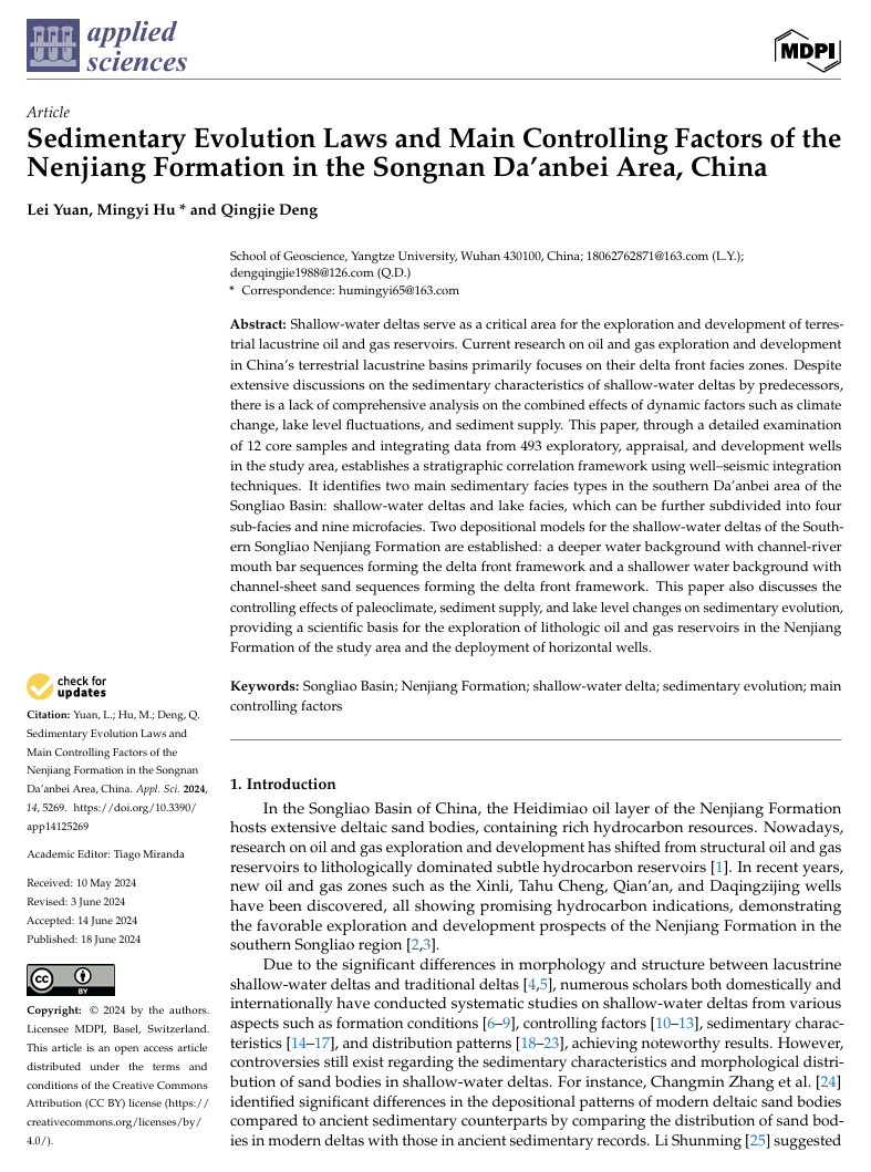 伟德国际1949官网硕士生袁磊在期刊《Applied sciences》上发表了题为“Sedimentary Evolution Laws and Main Controlling Factors of theNenjiangFormation in theSongnanDa’anbeiArea, China”的研究论文。伟德国际1949官网为论文第一署名单位,袁磊为第一作者,其导师胡明毅教授为该文通讯作者。