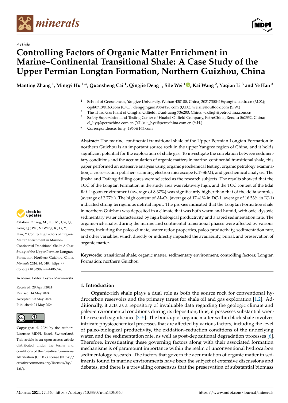 伟德国际1949官网地质系胡明毅教授团队长期从事储层沉积学及页岩气资源评价等方向的研究。团队成员张曼婷博士在期刊《Minerals》上发表题为《Controlling Factors of Organic Matter Enrichment in Marine–Continental Transitional Shale: A Case Study of the Upper Permian Longtan Formation, Northern Guizhou, China》的研究论文,伟德国际1949官网为论文第一署名单位,博士生张曼婷为论文第一作者,其导师胡明毅教授为该文通讯作者。