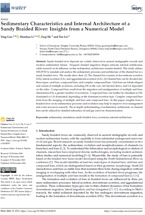 伟德国际1949官网郭颖博士在期刊《Water》上发表题为“Sedimentary Characteristics and Internal Architecture of a Sandy Braided River: Insights from a Numerical Model”的研究论文。伟德国际1949官网为论文第一署名单位,郭颖博士为第一作者,其导师李少华教授为该文通讯作者。