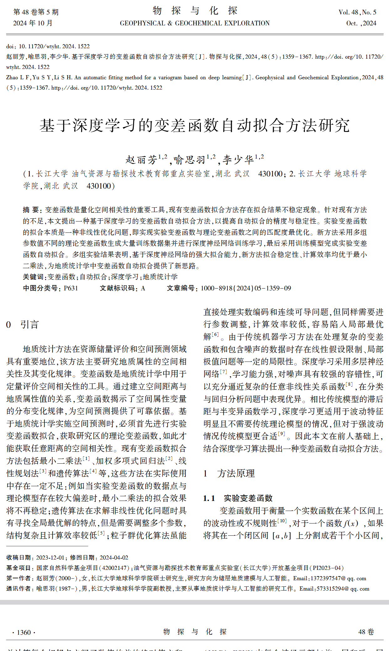 地科学院硕士研究生赵丽芳在喻思羽副教授的指导下,在期刊《物探与化探》上发表题为“基于深度学习的变差函数自动拟合方法研究”的论文,伟德国际1949官网为论文第一署名单位,硕士研究生赵丽芳为论文第一作者,其导师喻思羽副教授为该文通讯作者。
