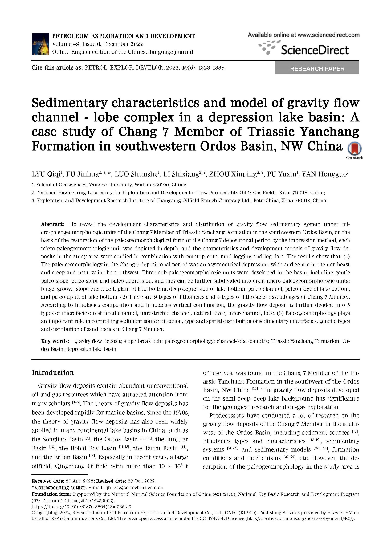 地科学院教师吕奇奇副教授以第一作者身份在石油领域重要期刊《Petroleum Exploration and Development》发表题为《Sedimentary characteristics and model of gravity flow channel - lobe complex in a depression lake basin: A case study of Chang 7 Member of Triassic Yanchang Formation in southwestern Ordos Basin, NW China》的研究论文,该项研究得到了国家自然科学基金项目和国家重点基础研究发展计划“973”项目的资助。