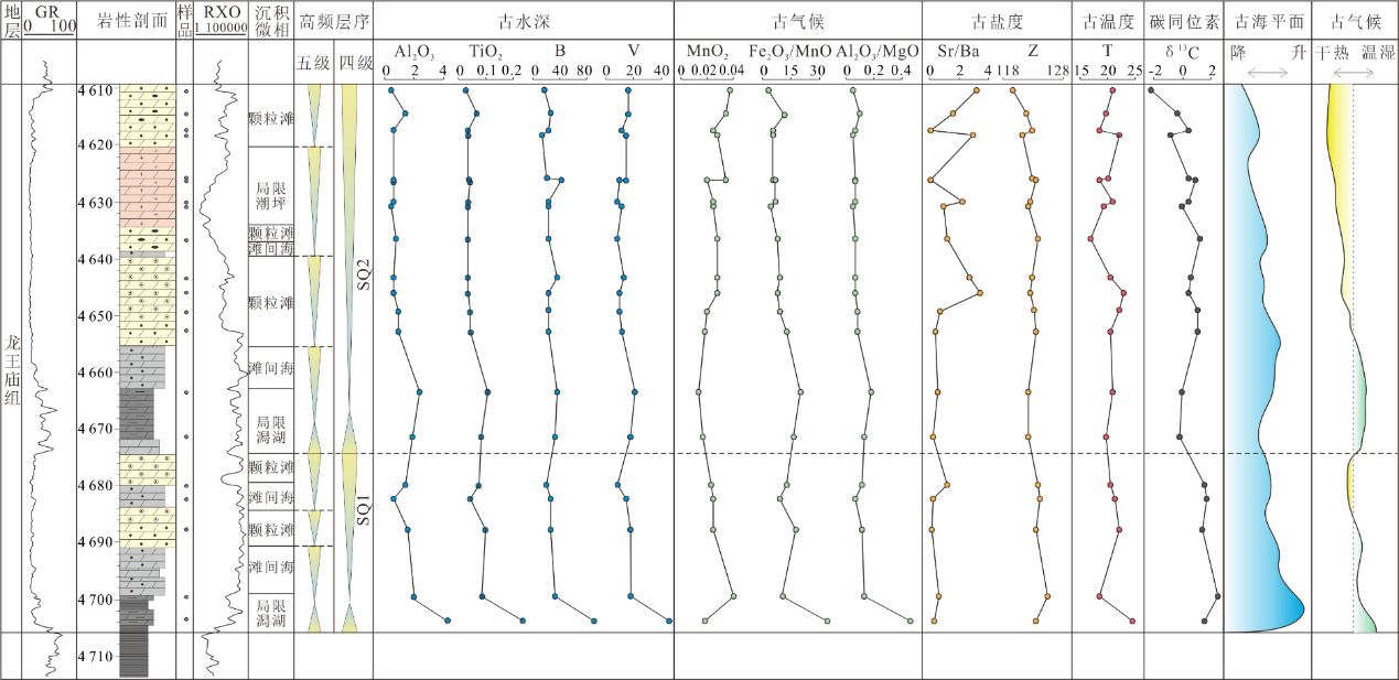 研究发现,龙王庙组主要发育云质潟湖、滩间海、颗粒滩和云坪4种沉积微相,可清晰识别可区域对比的2个四级层序。龙王庙组的δ13C具有两个变化周期,指示两次海平面升降,这与Al2O3、TiO2、B和V元素变化所反映的古水深变化一致。碳和氧同位素估算的古海水Z值和温度,以及Mg、Ca良好的相关性,共同反映干旱炎热气候和亚热带海洋环境;MgO/CaO、MnO2、Fe2O3/MnO2和Al2O3/MgO的规律性变化,指示两个层序早期的气候短暂过渡为温暖潮湿;Sr/Ba值反映沉积晚期海水盐度明显增高。