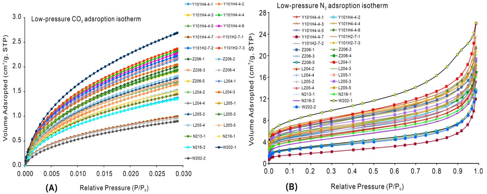 图1(A)五峰-龙马溪页岩样品的低压二氧化碳吸附等温线图;(B)五峰-龙马溪页岩样品的低压N2吸附等温线图