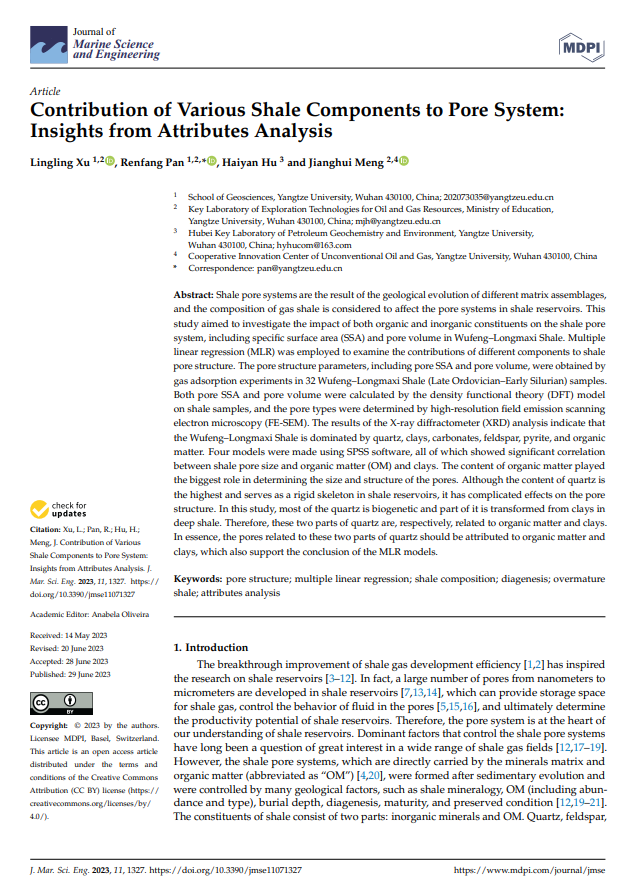 伟德国际1949官网石油系潘仁芳教授在海洋地质学领域主流期刊《Journal of Marine Science and Engineering》(JMSE)上发表题为“Contribution of Various Shale Components to Pore System: Insights from Attributes Analysis”的研究论文。