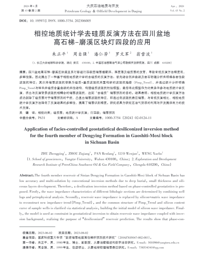 伟德国际1949官网地科系教师朱正平博士在石油地质学领域主流期刊《大庆石油与地质》上发表题为“相控地质统计学去硅质反演方法在四川盆地高石梯-磨溪区块灯四段的应用”的研究论文。